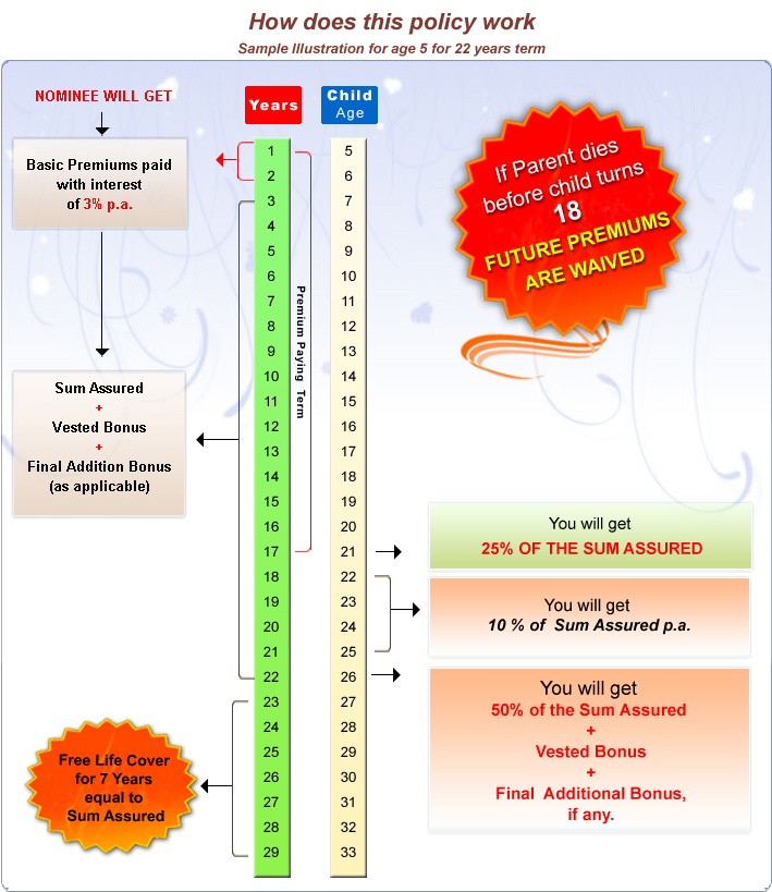 • Premium Waiver Benefit: All balance premiums waived if parent dies before the premium paying term