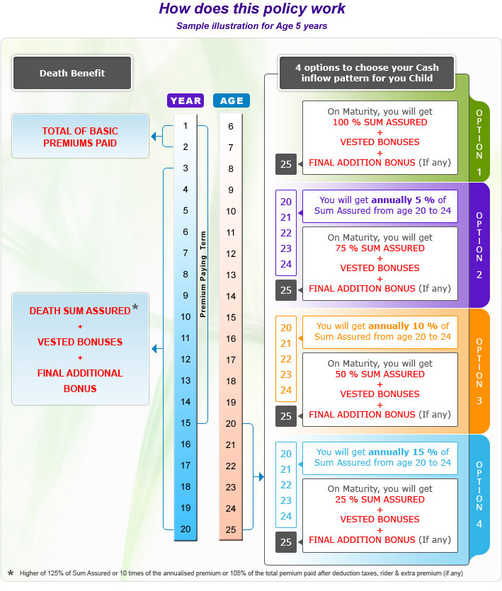 Option to take 5%, 10% or 15% of sum assured as survival benefit every year from 20 to 24 years of child''s age